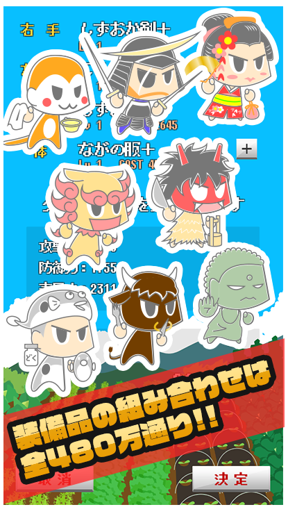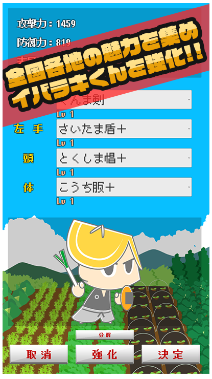 奪った魅力を装備し、勇者イバラキを強化しよう。なまはげの頭や竜馬のピストルなど、47都道府県×4パーツで組み合わせ総数はなんと480万通り!